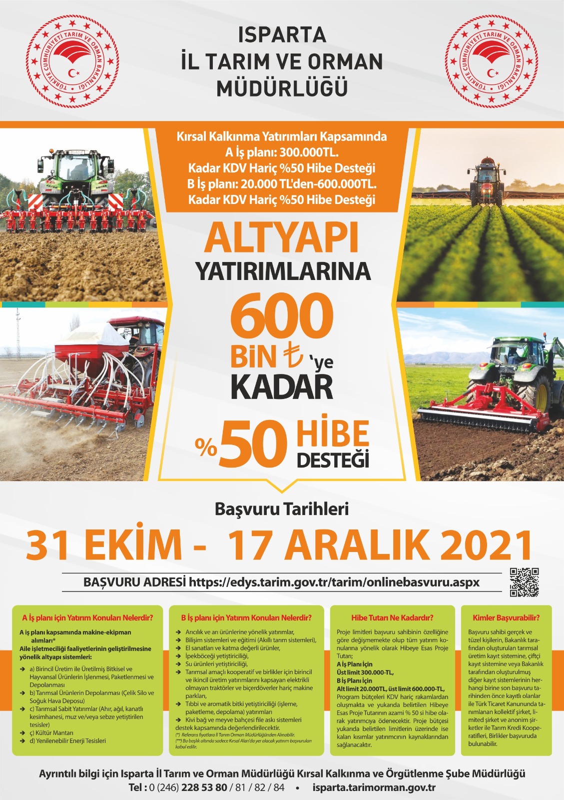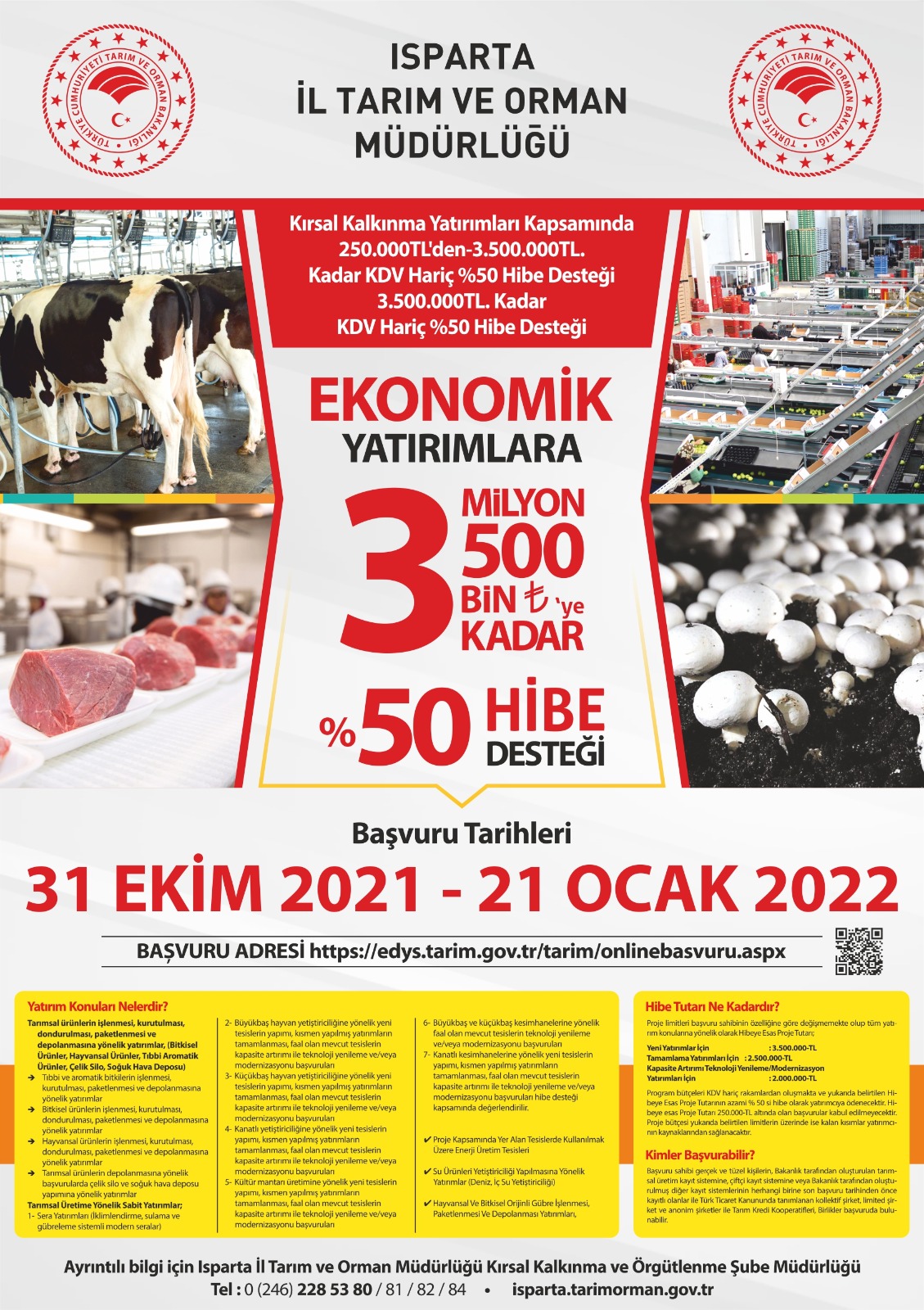 Söz konusu desteklemelerden yararlanmak isteyenler yatırımcılar proje başvurularını https://edys.tarim.gov.tr/tarim/onlinebasvuru.aspx adresi üzerinden yapabilirler.